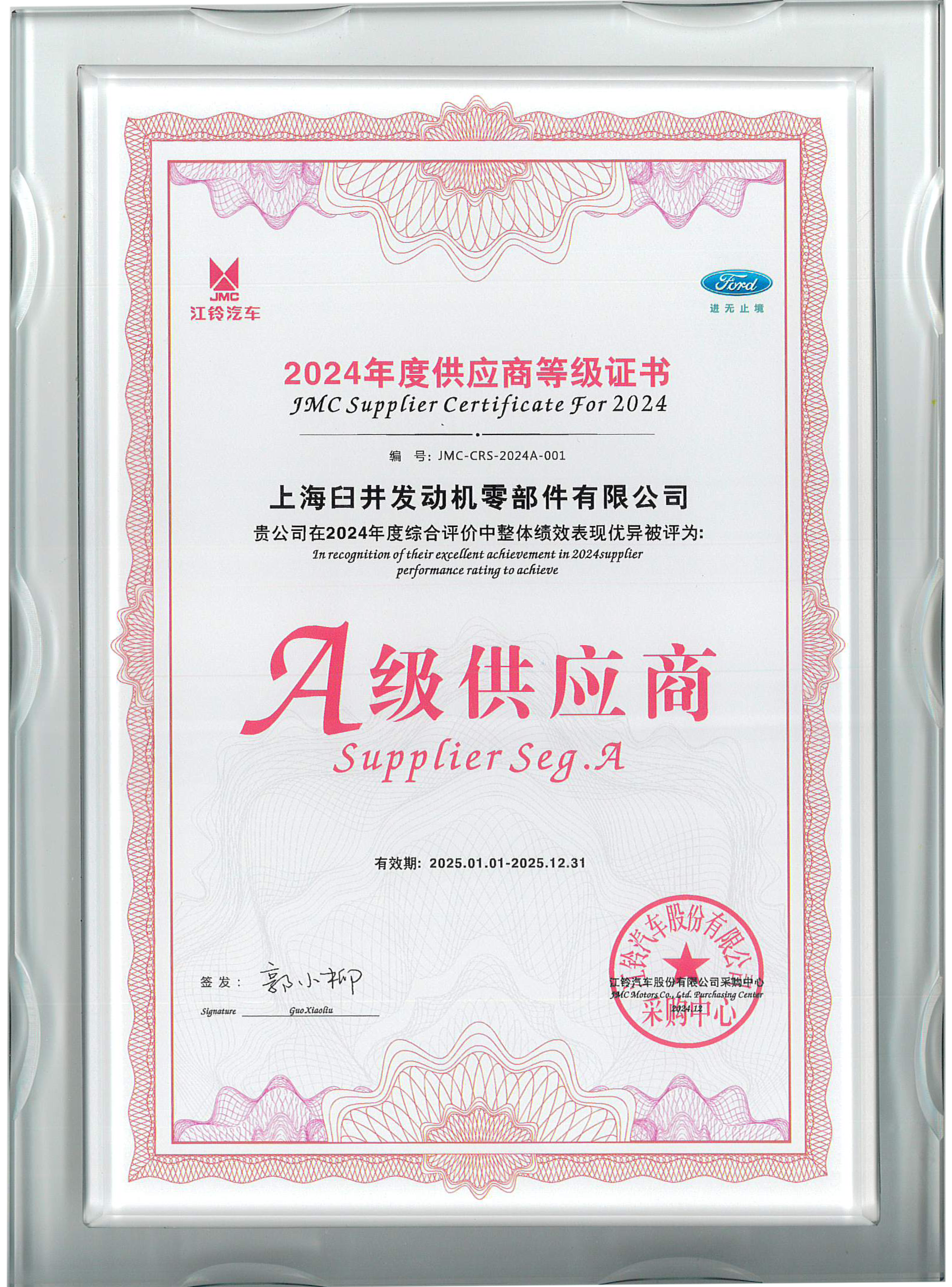 江鈴汽車授予 上海臼井公司"2024年度供應商等級"證書,評為“A級供應商”。